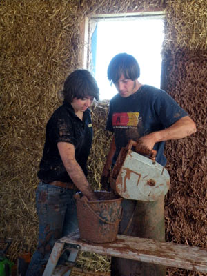Juin 2010,réouverture de la maison, pose du mélange argileux à l'intérieur de la maison des visiteurs