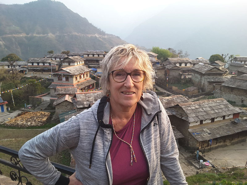 Arrivée de Julie 9eme jour 13 mars : Départ tôt le matin en minibus à Sarangkot pour admirer le lever du soleil pour découvrir les hauts sommets de la vallée (Dhaulagiri, Ganesh, Machapucharé, Annapurna etc..Nuit à Haven O'Ganga) (amchi school + Hyanja Monastry)