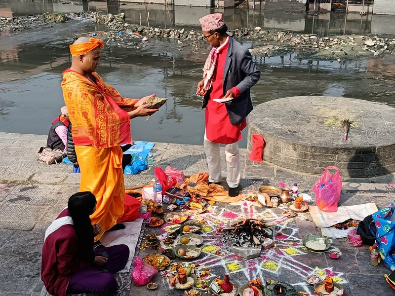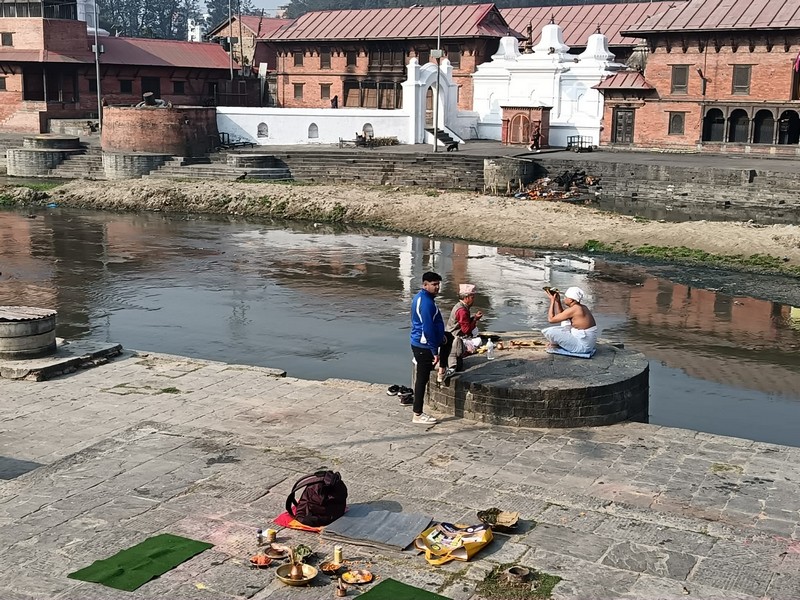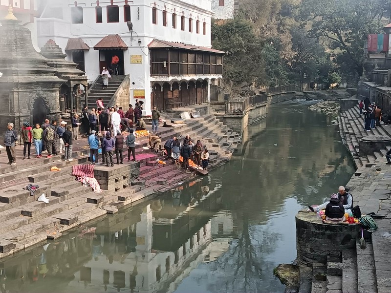 Visite des Ghâts de Pashupathinath : le TEMPLE DE PASHUPATINATH situé à cinq kilomètres à lest de Kathmandou, il est dédié au dieu Shiva avec ses deux toitures dorées et ses portes dargent est célèbre pour sa superbe architecture. Il est interdit au non-hindouiste mais les voyageurs peuvent bien voir le temple et les activités qui y règnent depuis la rive est de la Bagmati, la rivière sacrée qui coule sur ce site sacré pour les hindouistes, lieu des crémations et rencontre avec les sadhus. sur les rives de la rivière Bagmati, Pashupatinath est, pour les hindous, l'un des lieux de pèlerinage les plus importants, avec Varanasi (Benares) et Hardwar-Rishikesh. Shiva est la divinité hautement vénérée ici. Le nombre d'ascètes errants (saddhus) en témoigne. Mais cette visite décevra peut-être les visiteurs. En effet, le fort beau temple de Pashupati (autre nom de Shiva, sous sa forme de Seigneur des troupeaux) est inaccessible à qui n'est pas hindou et les gardes armés à l'entrée sont patibulaires à souhait On pouvait contourner le temple et, par une immense porte à doubles vantaux gardée par un soldat pas du tout débonnaire, apercevoir, au loin dans la cour intérieure d'accès, un colossal Nandi de pierre qui, assis, tourne le dos et exhibe, de ce fait, généreusement ses attributs... . Les crémations rituelles ont lieu sur la berge opposée de la rivière. La discrétion est recommandée. On montera sur les escaliers en terrasse, d'où l'on a vue sur le temple. On peut aussi observer autour de soi les rangées fort esthétiques de petits chaitya dont chacun abrite un Shiva lingam. Quelques statues valent la photo; observer, en particulier, un Ganesh aux côtés d'un Garuda, une association rare. |