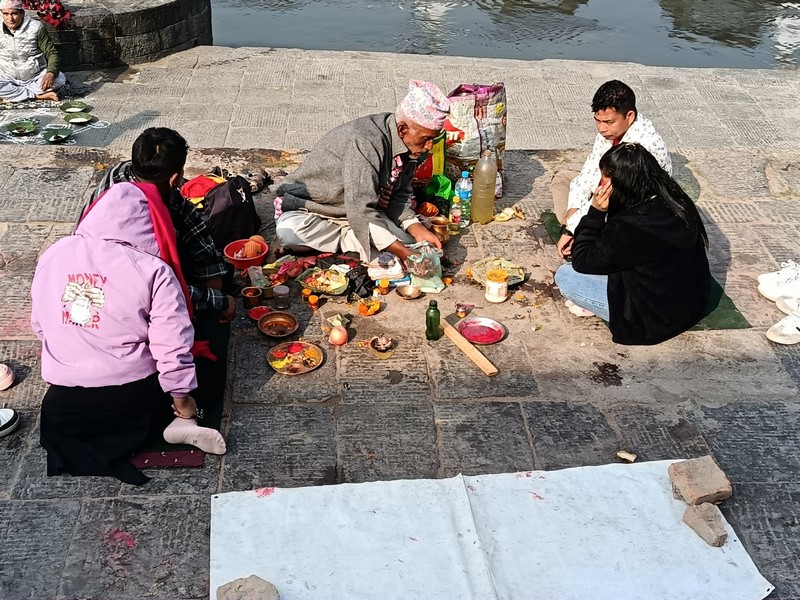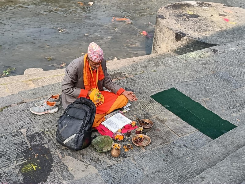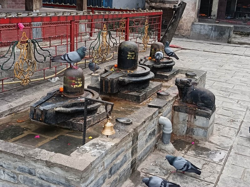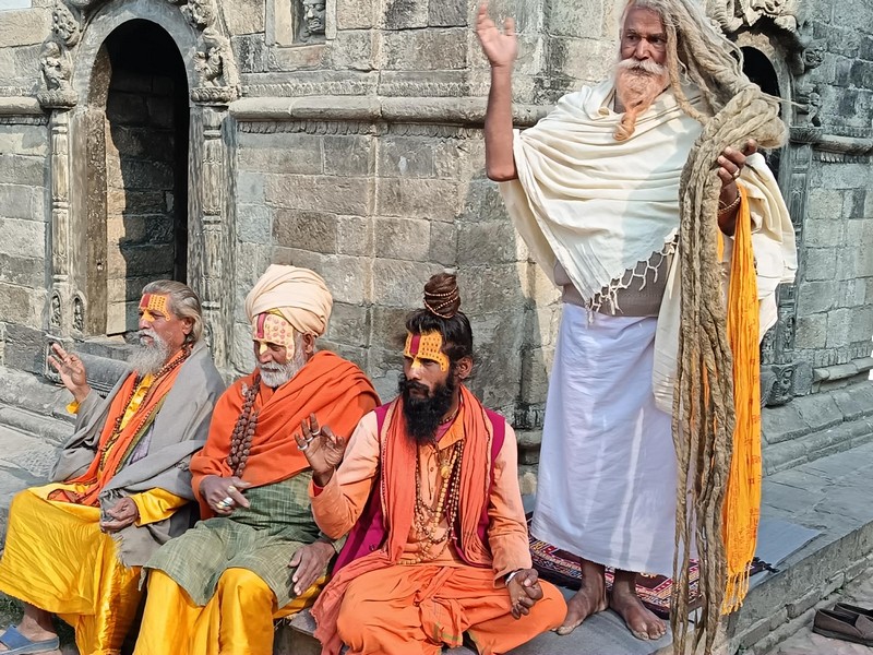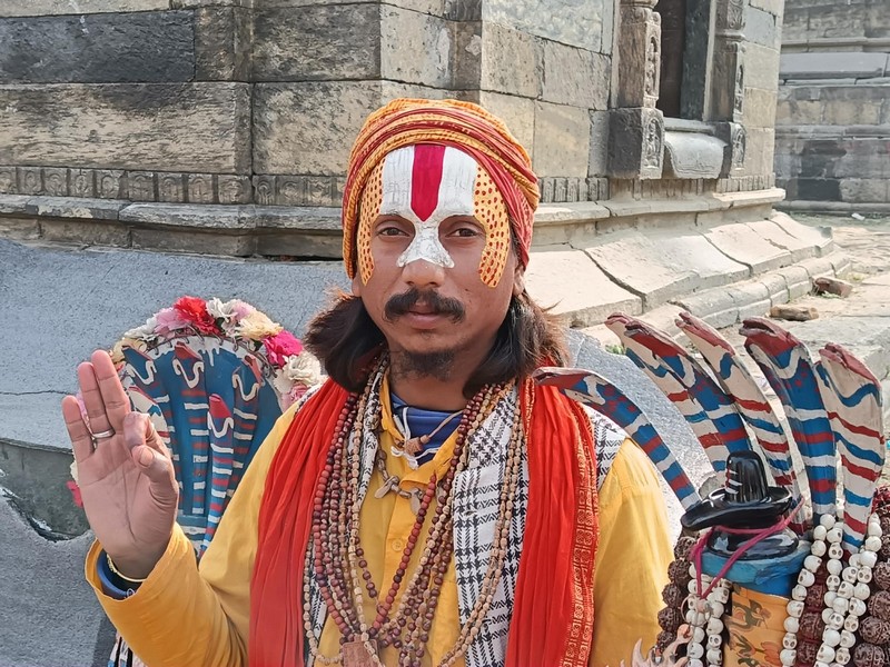 Visite des Ghâts de Pashupathinath : le TEMPLE DE PASHUPATINATH situé à cinq kilomètres à lest de Kathmandou, il est dédié au dieu Shiva avec ses deux toitures dorées et ses portes dargent est célèbre pour sa superbe architecture. Il est interdit au non-hindouiste mais les voyageurs peuvent bien voir le temple et les activités qui y règnent depuis la rive est de la Bagmati, la rivière sacrée qui coule sur ce site sacré pour les hindouistes, lieu des crémations et rencontre avec les sadhus. sur les rives de la rivière Bagmati, Pashupatinath est, pour les hindous, l'un des lieux de pèlerinage les plus importants, avec Varanasi (Benares) et Hardwar-Rishikesh. Shiva est la divinité hautement vénérée ici. Le nombre d'ascètes errants (saddhus) en témoigne. Mais cette visite décevra peut-être les visiteurs. En effet, le fort beau temple de Pashupati (autre nom de Shiva, sous sa forme de Seigneur des troupeaux) est inaccessible à qui n'est pas hindou et les gardes armés à l'entrée sont patibulaires à souhait On pouvait contourner le temple et, par une immense porte à doubles vantaux gardée par un soldat pas du tout débonnaire, apercevoir, au loin dans la cour intérieure d'accès, un colossal Nandi de pierre qui, assis, tourne le dos et exhibe, de ce fait, généreusement ses attributs... . Les crémations rituelles ont lieu sur la berge opposée de la rivière. La discrétion est recommandée. On montera sur les escaliers en terrasse, d'où l'on a vue sur le temple. On peut aussi observer autour de soi les rangées fort esthétiques de petits chaitya dont chacun abrite un Shiva lingam. Quelques statues valent la photo; observer, en particulier, un Ganesh aux côtés d'un Garuda, une association rare. |